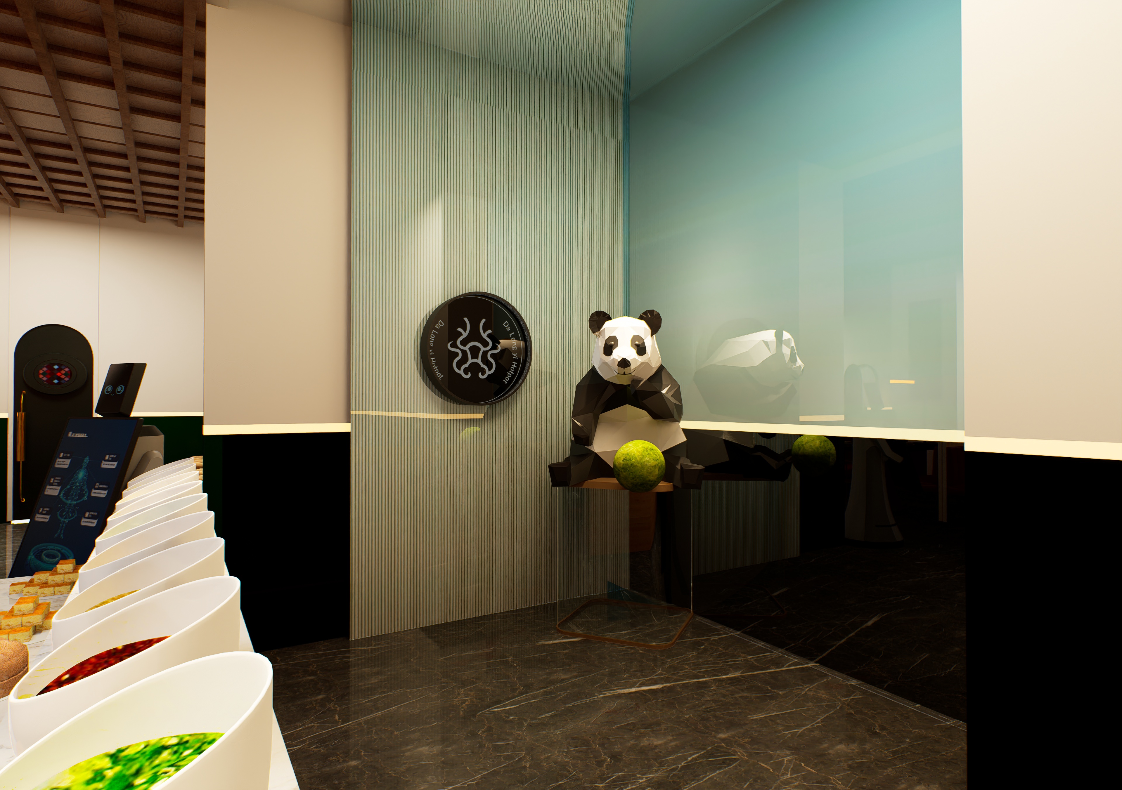 The entrance integrates panda installations and dragon motifs, combined with robotic reception to create a strong first impression blending culture and technology.